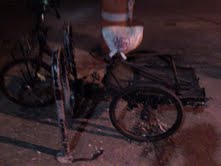a bicycle rickshaw.  Or perhaps what was once a bicycle rickshaw before she pedaled it through the forest fire in the end of Bambi.  Last night, the young hipster parked her vehicle and carried groceries from Whole Foods into a luxury condo.  She stopped only once, to look back at her beloved charred bicycle rickshaw. I think we can be sure she was wishing she could bring it inside and cuddle it close to her on that cold, cold night.