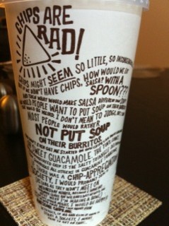 You see what I’m saying here?  Chipotle didn’t find a crazy scrawler and ask him to write on their cups about guacamole.  He was always scrawling crazy about guacamole.  Chipotle just gave him the cups.